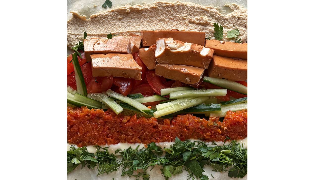 Шакшука з індичкою пастрамі, печеним перцем і крем-фетою